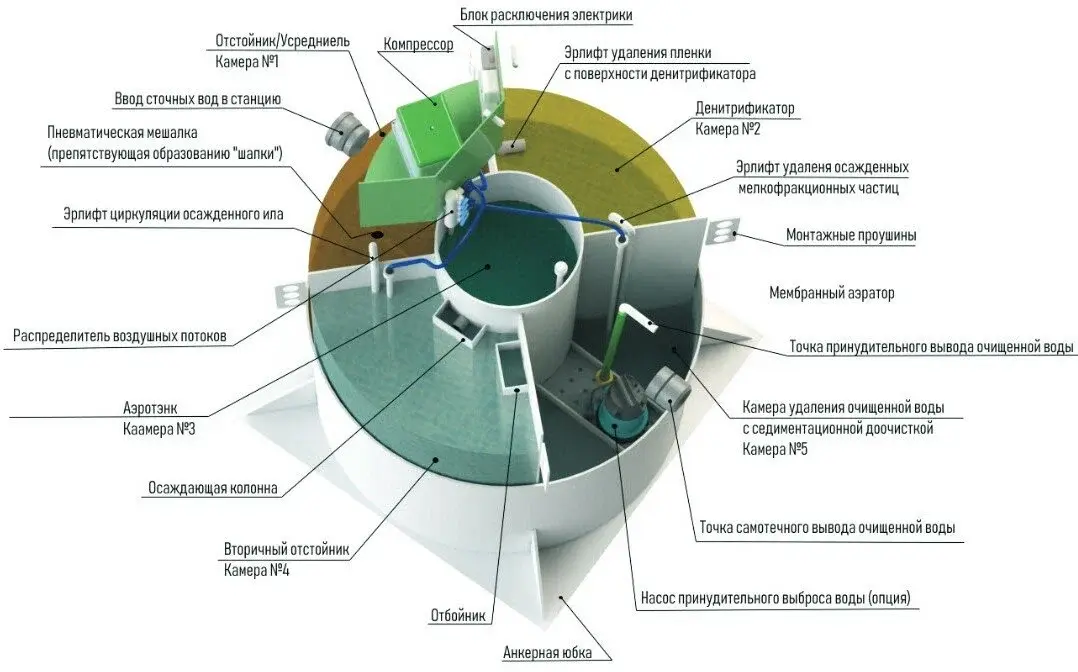 Станция биологической очистки Итал БИО 6 лонг — современное решение для автономной канализации в частном доме или коттедже. Рассчитана на обслуживание семьи из 6 человек, обеспечивает производительность 1,1 м³/сутки при максимальном залповом сбросе 350 л. Конструкция включает три камеры с полем аэрации для эффективной очистки сточных вод. Вертикальный цилиндрический корпус выполнен из прочного полиэтилена низкого давления (ПНД) толщиной 8 мм, что гарантирует долговечность и надёжность эксплуатации. Преимущества модели: возможность установки на глубине до 1250 мм, наличие компрессорной станции, опция принудительного отвода очищенной воды с помощью дренажного насоса. Компактные размеры (диаметр 1475 мм, высота 2100 мм) и умеренный вес 153 кг упрощают транспортировку и монтаж. Гарантийный срок составляет 3650 дней, а предполагаемый срок службы достигает 50 лет при правильном обслуживании.